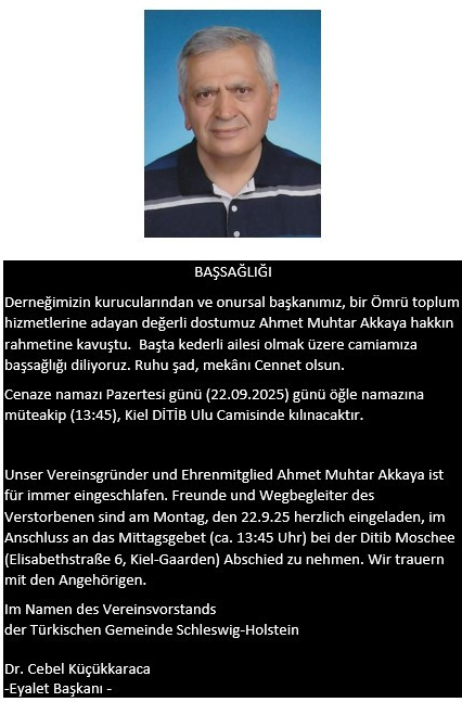 Unser Vereinsgründer und Ehrenmitglied Ahmet Muhtar Akkaya ist für immer eingeschlafen. Freunde und Wegbegleiter des Verstorbenen sind am Montag, den 22.9.25 herzlich eingeladen, im Anschluss an das Mittagsgebet (ca. 13:45 Uhr) bei der Ditib Moschee (Elisabethstraße 6, Kiel-Gaarden) Abschied zu nehmen. Wir trauern mit den Angehörigen.